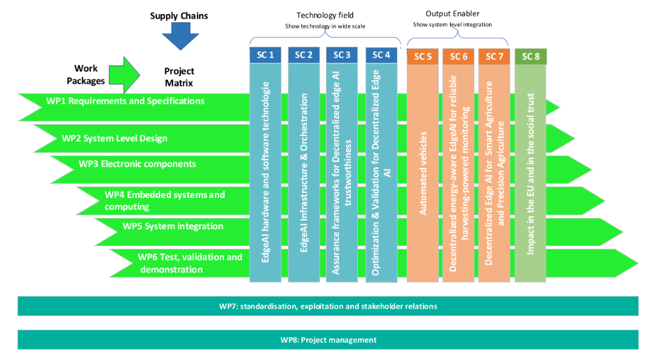 El trabajo desarrollado en el proyecto se organiza siguiendo una matriz donde se entrelazan los paquetes de trabajo (denominados “WP” o “Work Package” en el diagrama) y los campos de investigación en los que se desarrollarán las soluciones IA (denominados “SC” o “Supply Chain”)